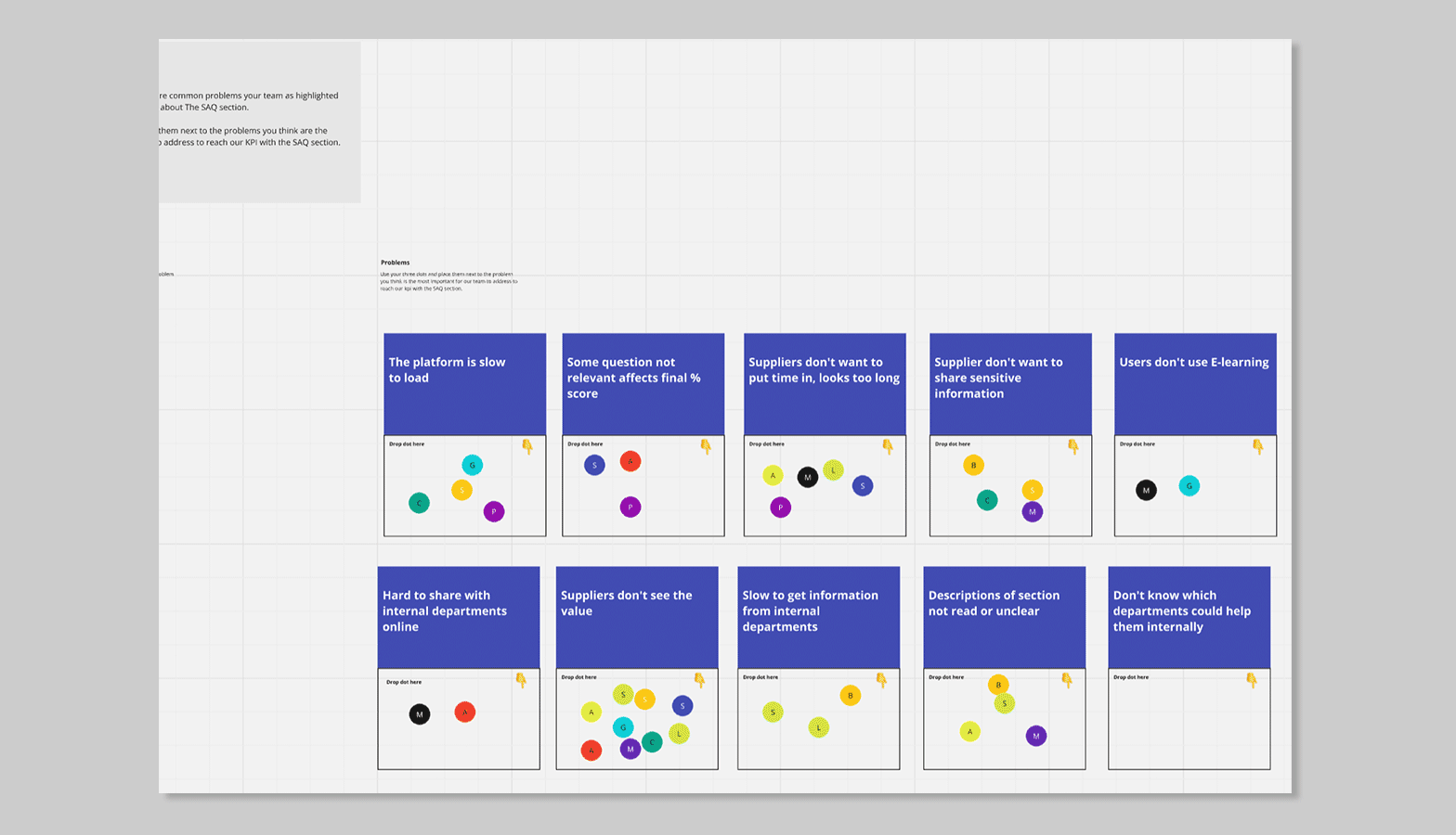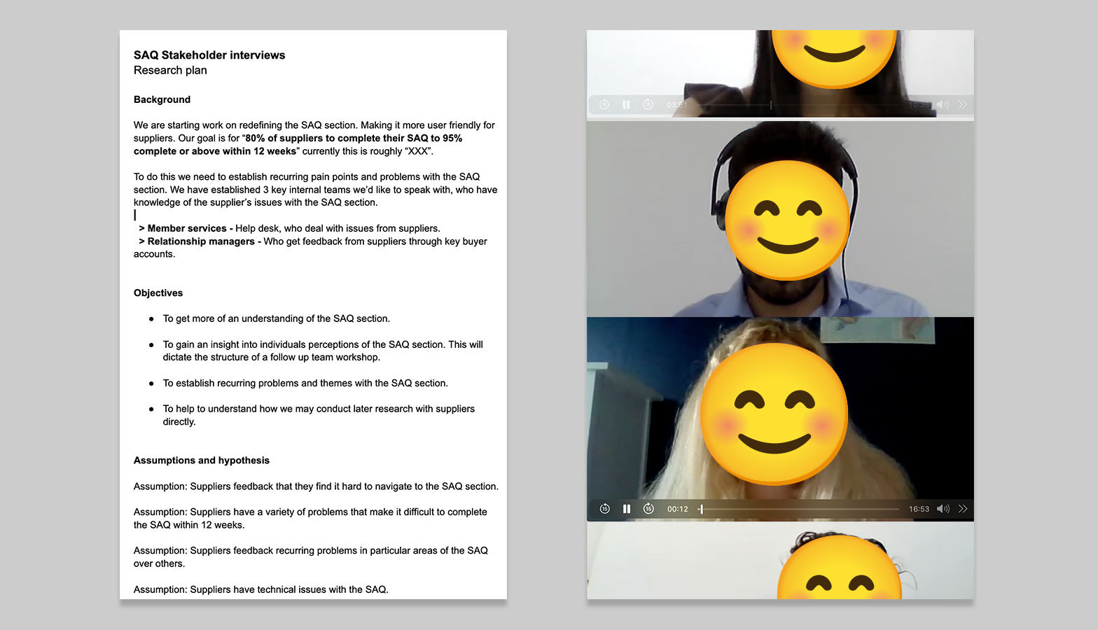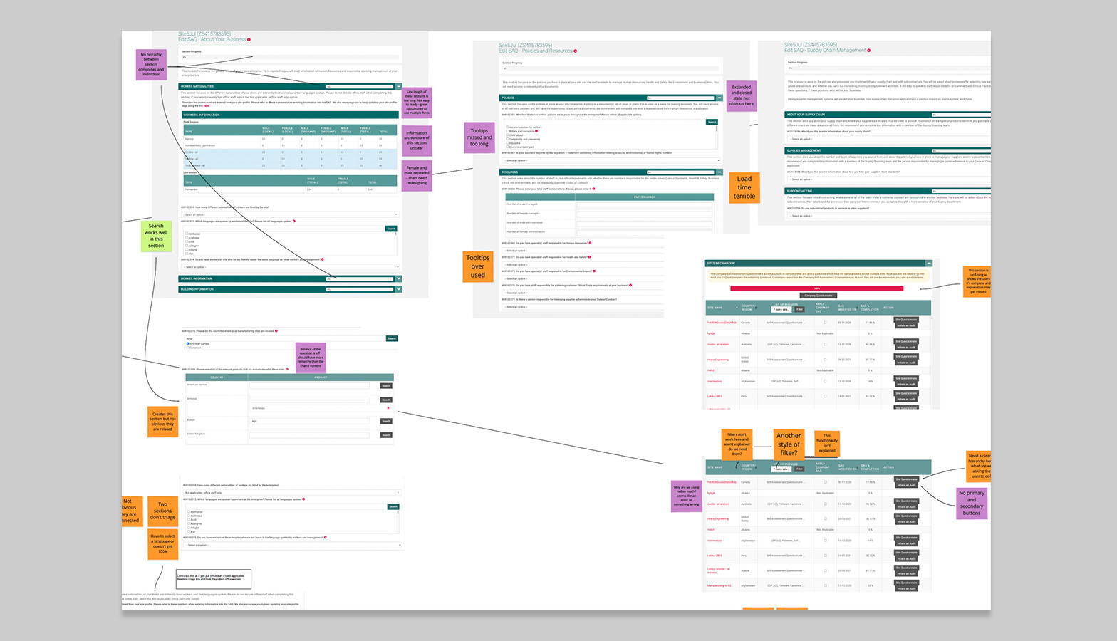 It was quicker and easier to start with internal teams to understand supplier pain points. I interviewed 10 Sedex staff across Member Services and Relationship Management to capture trends and frustrations. Findings were analysed in Airtable and high level findings were prioritised. I found suppliers often felt the SAQ was designed for buyers, not them. The system was slow, guidance was skipped, and people struggled to complete sections requiring input from multiple departments. This section also felt long and overwhelming, especially for users who may not use a computer or device regularly as part of their work.