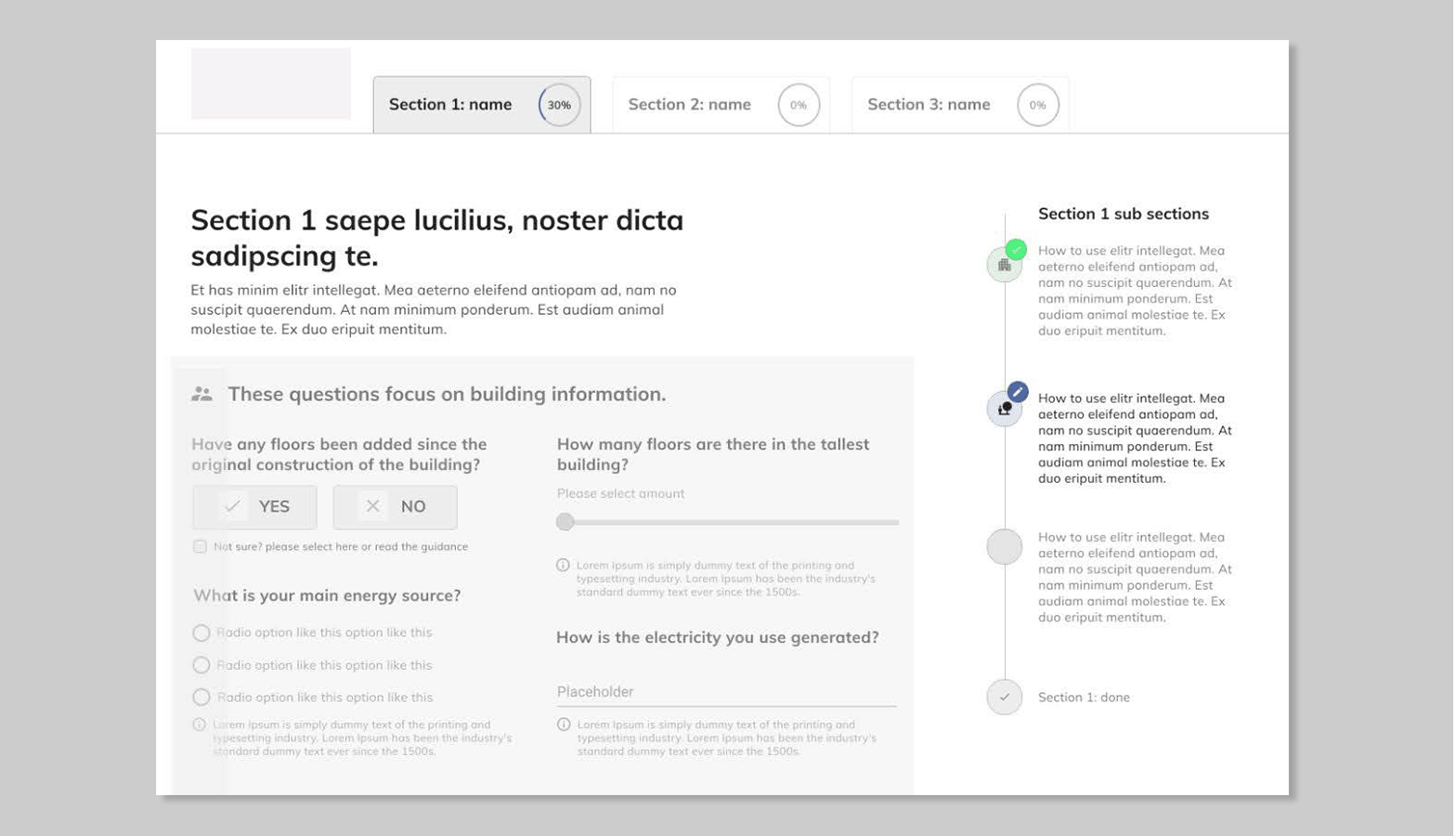 The team focused on redesigning the first 20 questions, a test section to validate changes before scaling. I mapped user journeys and sketched three different low-fidelity wireframes to explored layout, guidance, and progress feedback. Ideas were informed by research, audit insights, and previous workshops.
